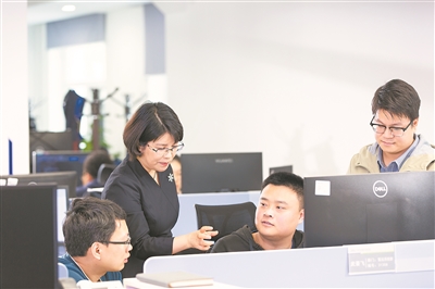 铁路12306青年技术攻关团队成员与中国铁道科学研究院集团有限公司首席研究员单杏花(左二)讨论技术难点。
